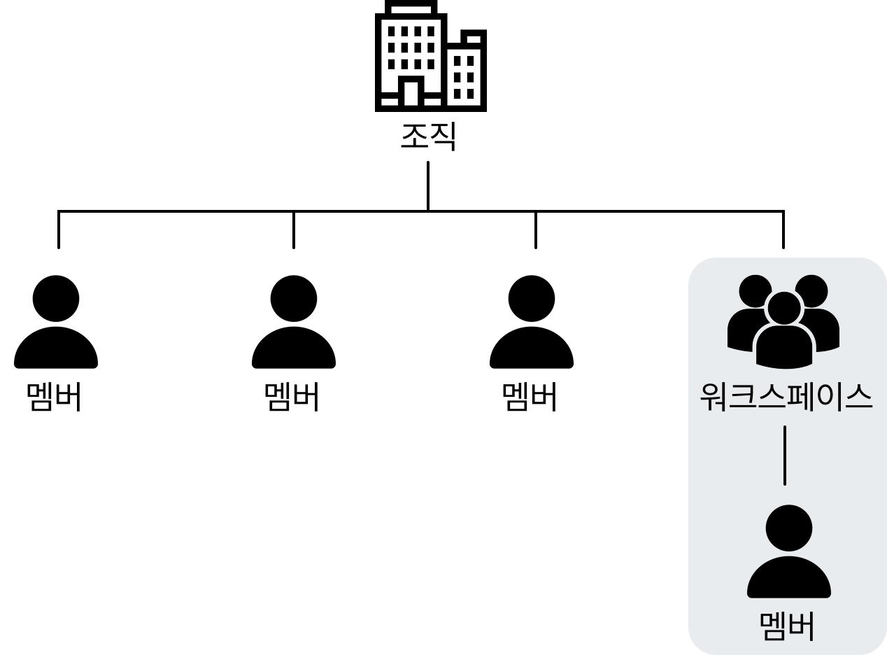 하나의 조직 안에서 여러 워크스페이스를 생성할 수 있으며, 각 워크스페이스에는 한 명 이상의 멤버가 참여할 수 있습니다.