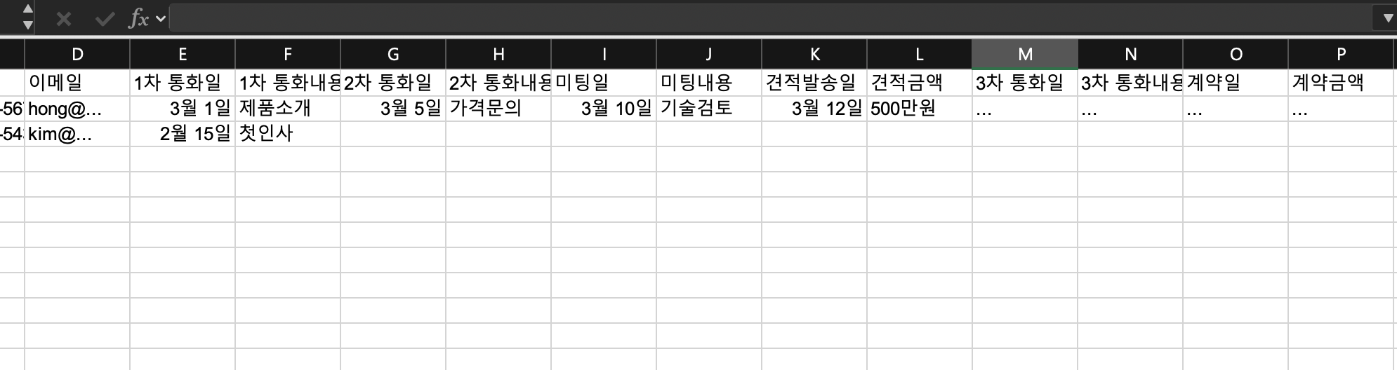 스프레드시트는 현재 상태를 기록하기에는 좋지만, 시간에 따른 변화를 추적하기에는 구조적으로 맞지 않습니다. 고객에게 전화한 날짜, 미팅한 내용, 보낸 메시지를 전부 셀에 기록하려면 열이 끝없이 늘어나거나, 별도의 시트를 만들어야 합니다.