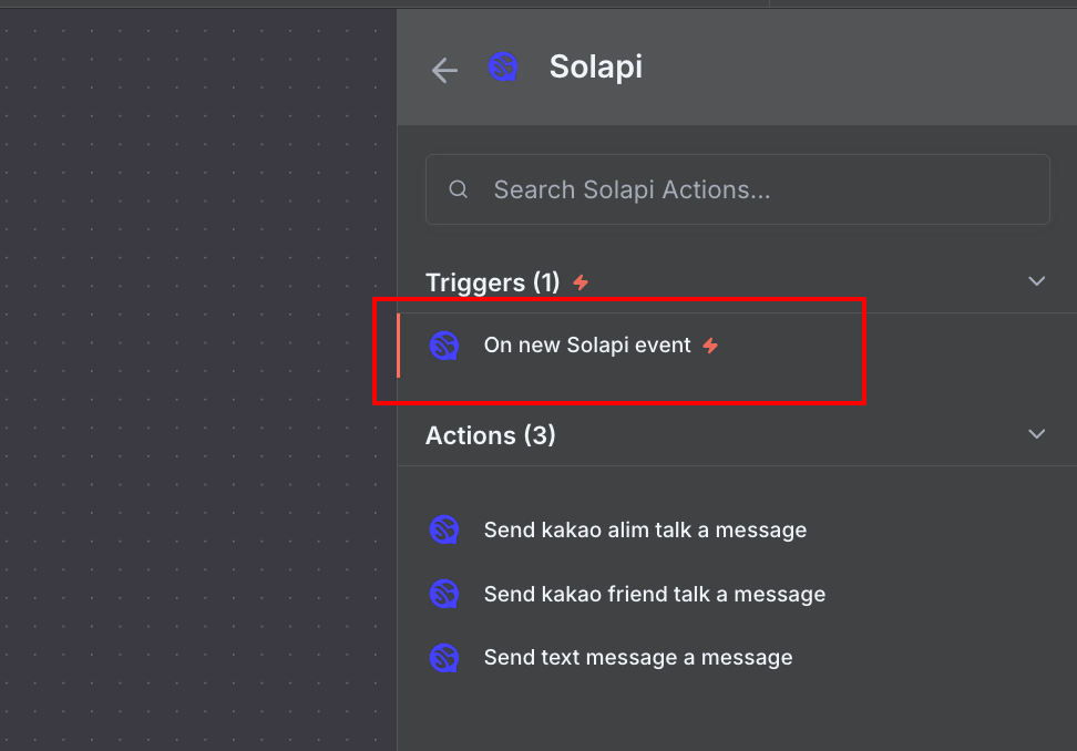 Solapi 로 검색하고 Triggers 아래 On new Solapi event 를 선택하세요.