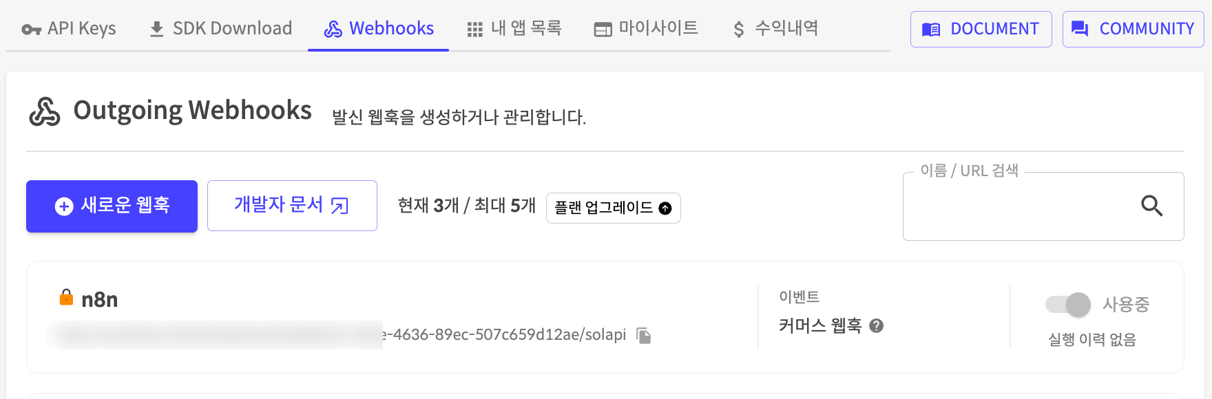만약, 웹훅 URL이 필요하신 경우 솔라피 웹훅 관리 페이지 (로그인 필요)를 통해 확인 가능합니다.
