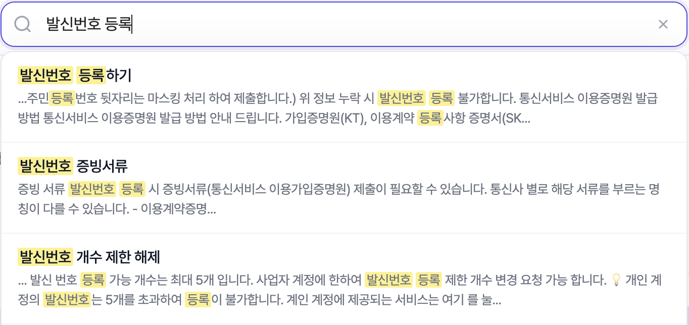 예를 들어 "발신번호 등록"을 검색하면, 관련 가이드 문서의 해당 내용이 있는 위치로 바로 이동해요. 긴 문서를 위아래로 스크롤하면서 원하는 내용을 직접 찾을 필요가 없어졌습니다!