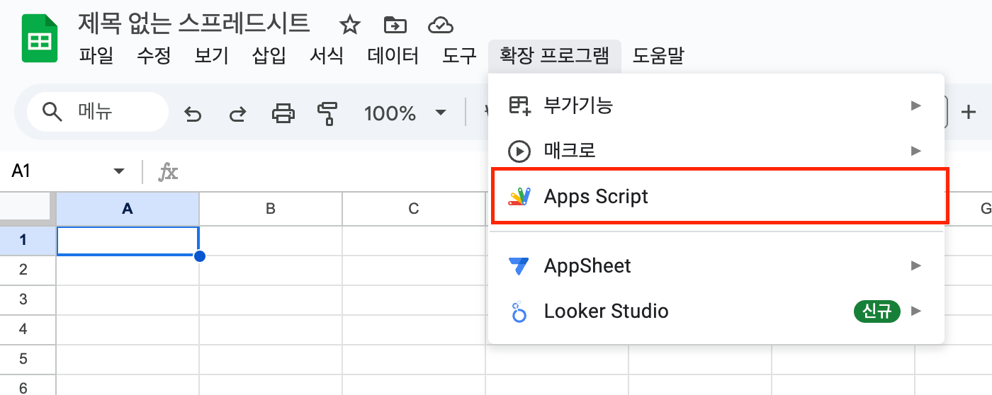 그 다음, 구글 스프레드시트 페이지의 메뉴에서 확장 프로그램 -> Apps Script 버튼을 클릭합니다.