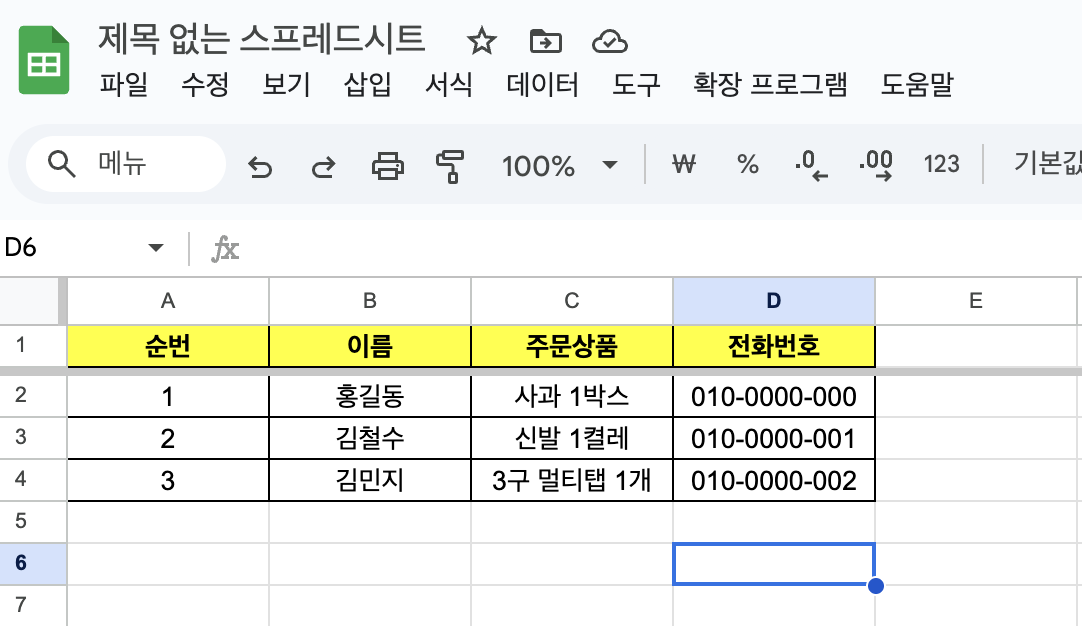 위의 사진은 이번 글에 예제로 사용될 구글 스프레드시트 데이터입니다.