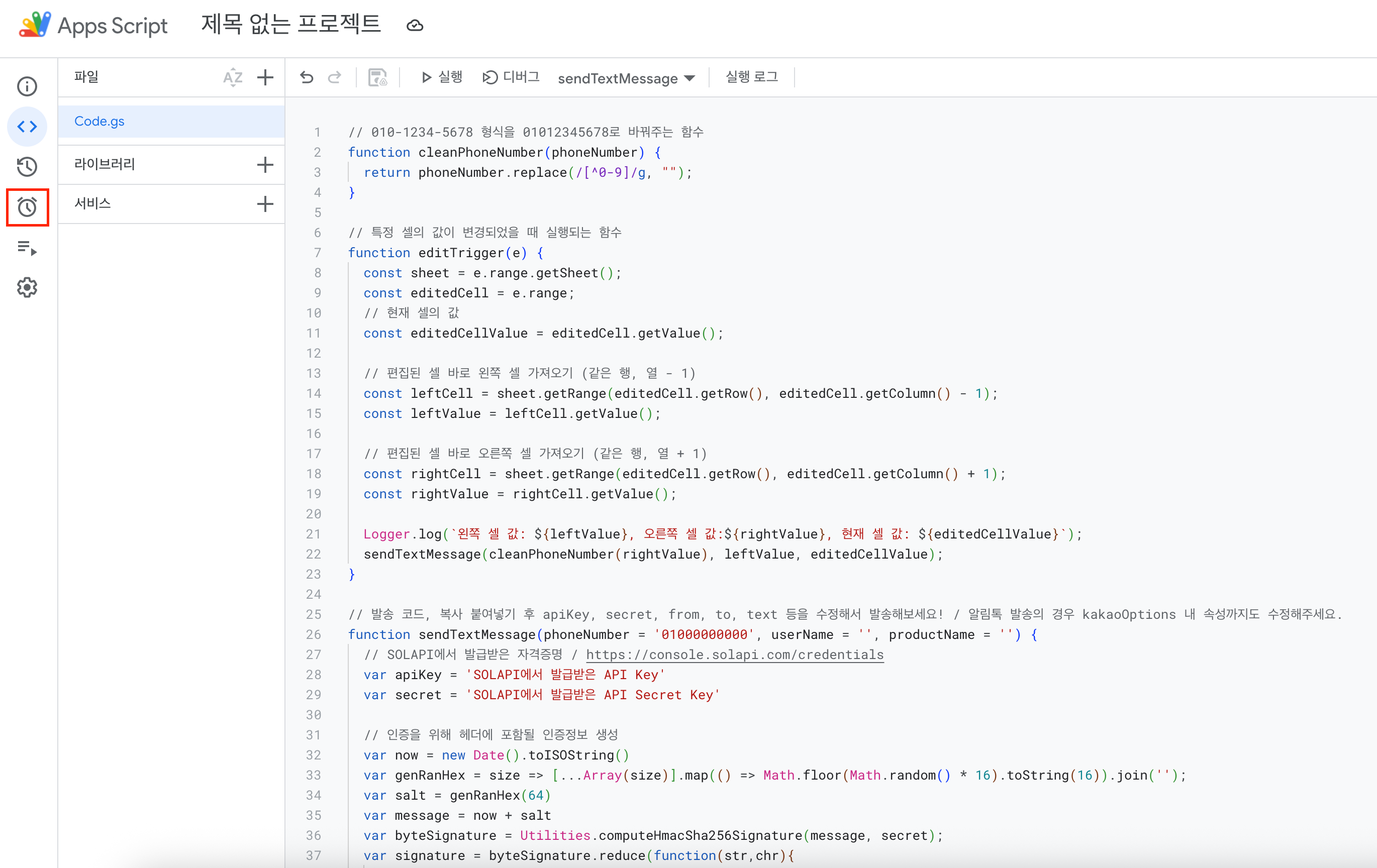 복사 붙여넣기 한 코드를 연동하시는 상황에 맞게 apiKey, secret, from, to 등을 수정한 다음, 트리거를 추가하는 방법을 설명해드리겠습니다.
