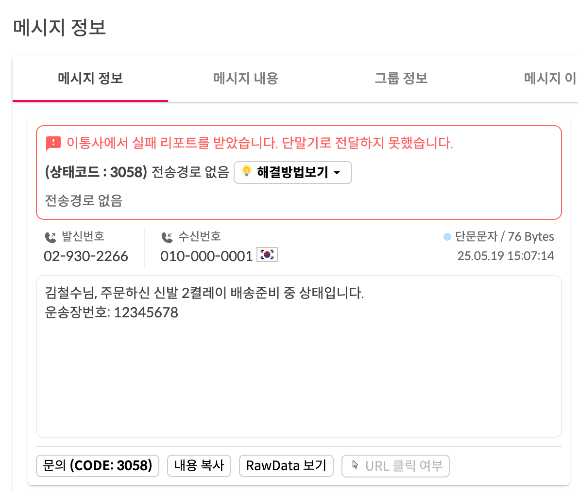 글에서는 발송이 실패가 되었지만, 이는 실제 존재하지 않는 번호로 발송하여 표시되는 상태값입니다.