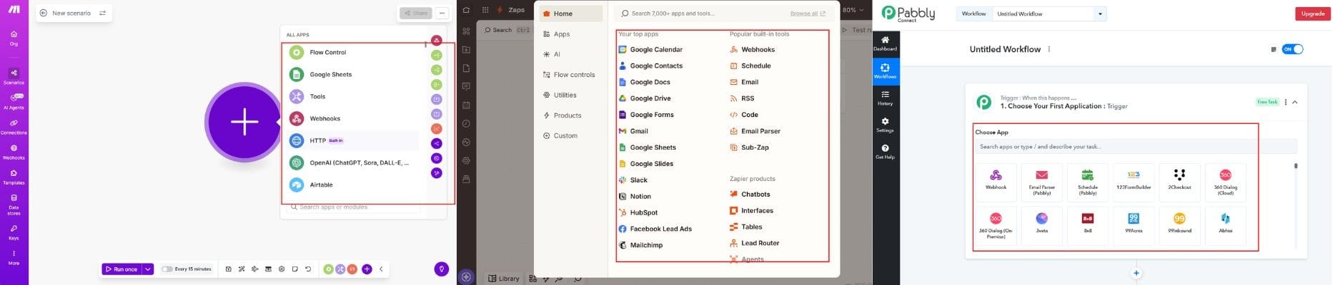 다른 서비스와 정식으로 연결할 수 있는 기능이 있을 때 가장 잘 작동합니다. Make·Zapier·Pabbly 등에 공식 App이 등록된 서비스라면 비교적 간단하게 메시지 자동화를 구성할 수 있습니다.