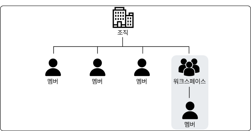 하나의 조직 내에서 여러 개의 워크스페이스를 생성할 수 있으며, 각 워크스페이스에는 한 명 이상의 멤버가 참여할 수 있습니다.