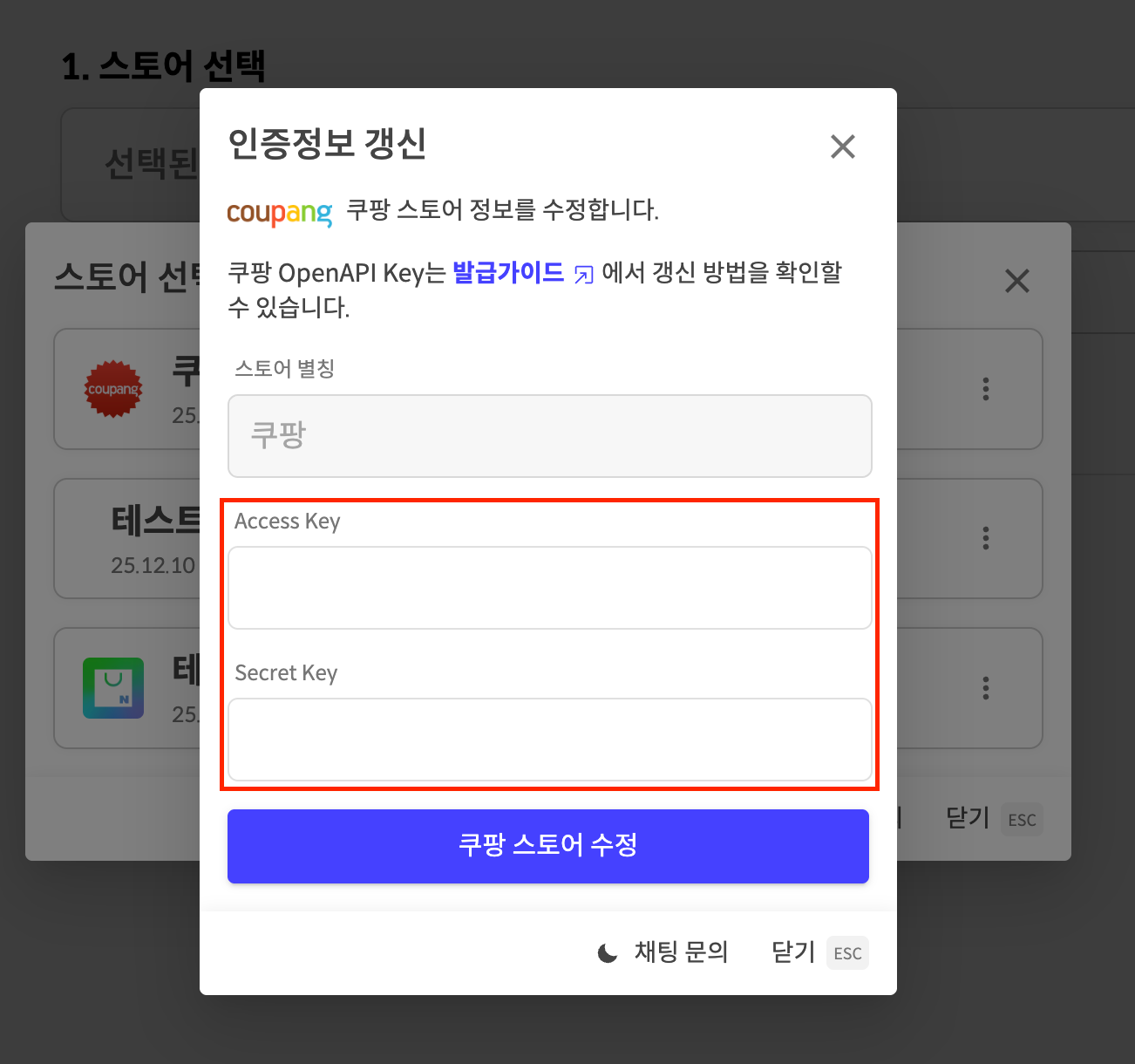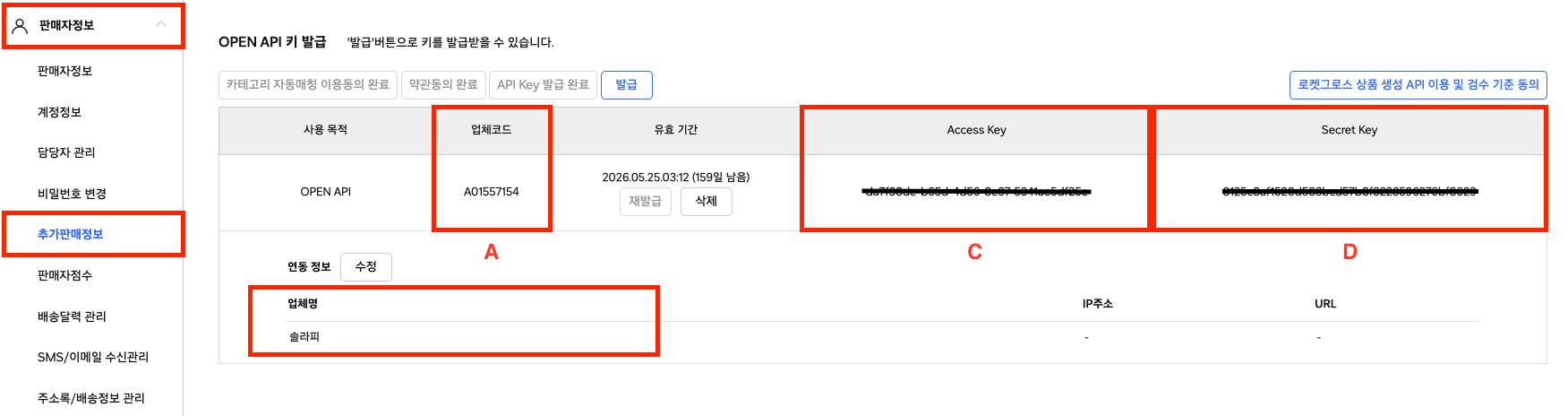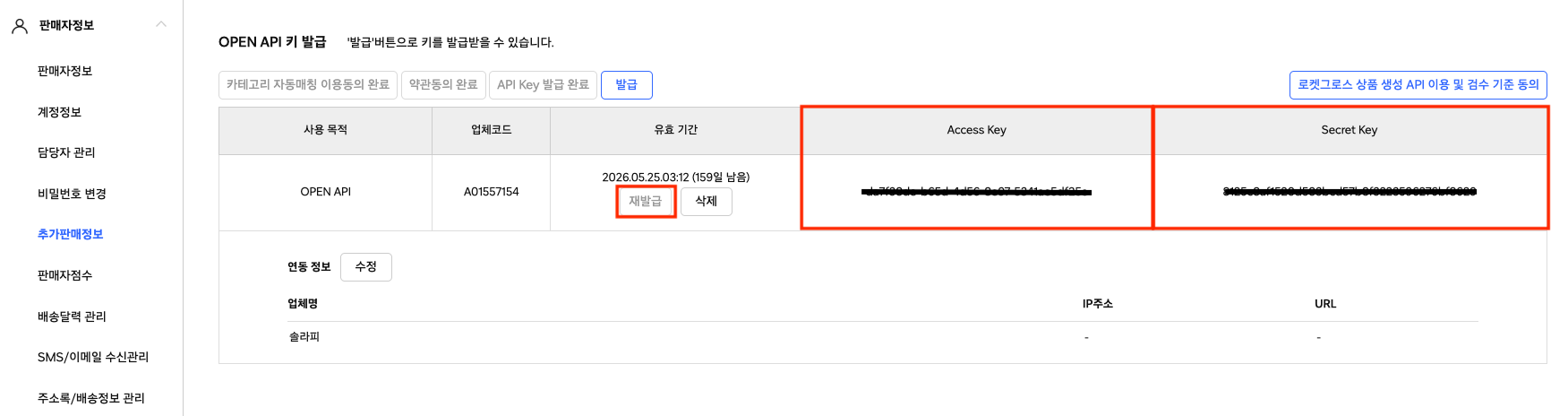 쿠팡윙에 접속한 후, 재발급 버튼을 누르면 Access Key, Secret Key가 새로 발급됩니다.