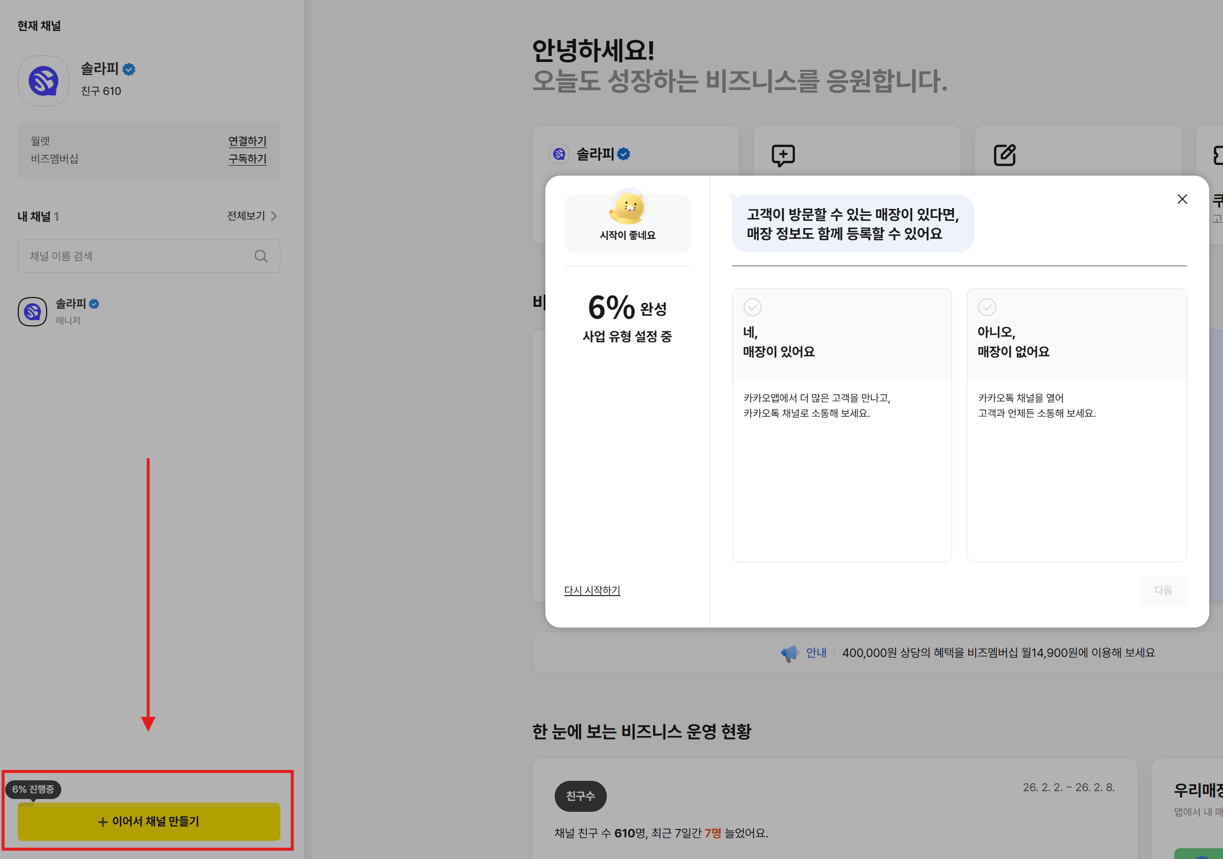 카카오 정책에 따라 비즈니스 인증이 완료 된 채널을 통해 알림톡, 친구톡을 발송할 수 있습니다. 비즈니스 채널 등록부터 솔라피와 연동방법까지 자세하게 안내 도와드릴게요! 순서에 맞춰 진행해 주시면 됩니다.😄