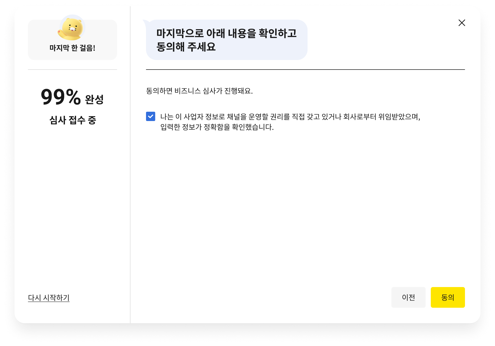 모든 정보 입력이 완료되면 약관에 동의한 뒤 심사를 신청할 수 있습니다.