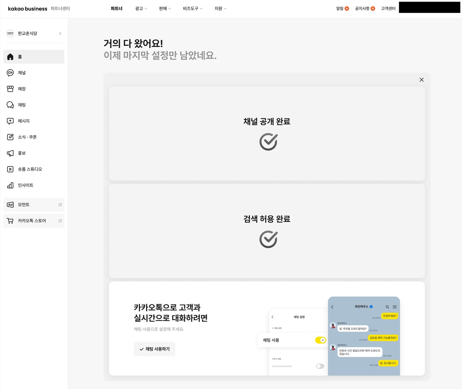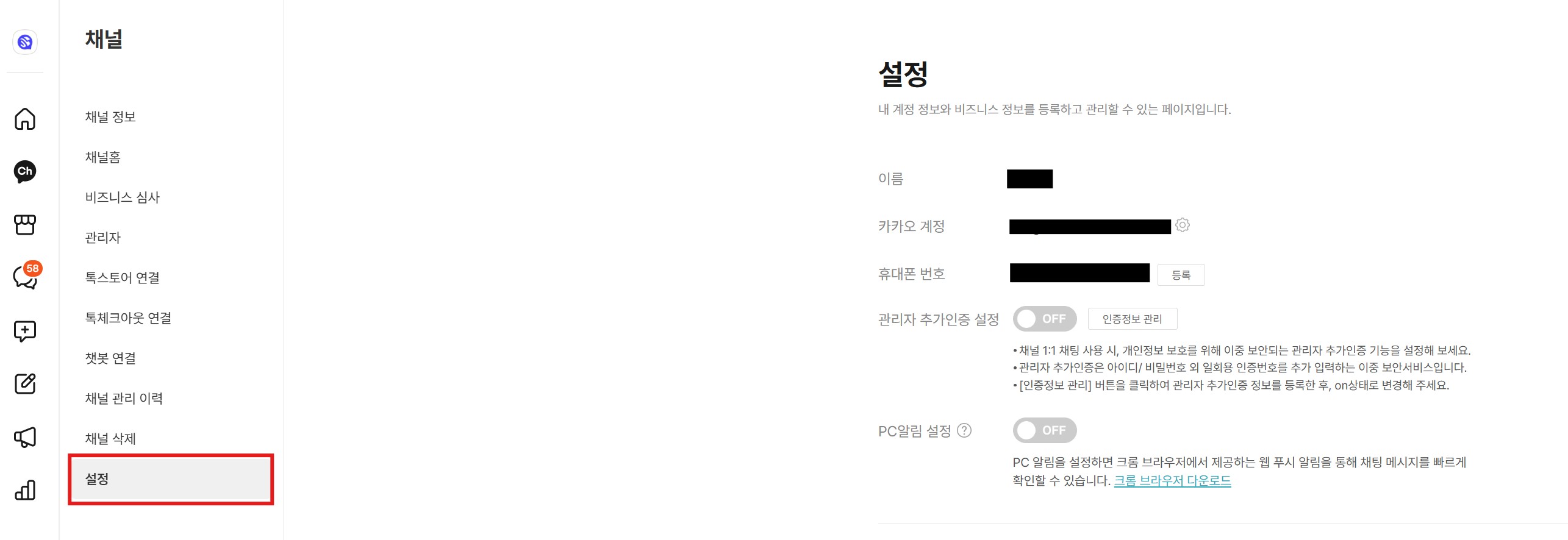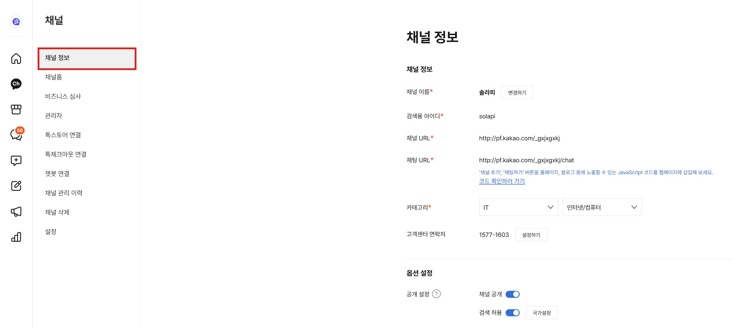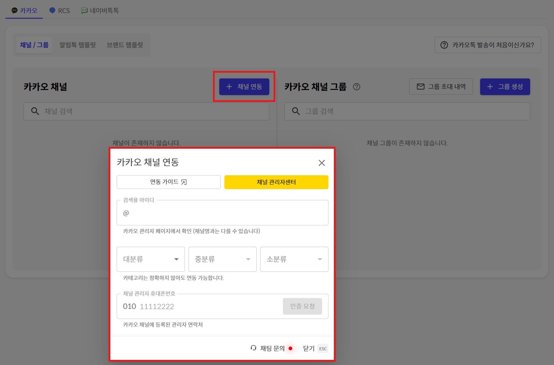 - 연동 방법 : 카카오채널 이동 > 검색용 아이디, 채널 카테고리 설정, 담당자 휴대폰 번호 입력