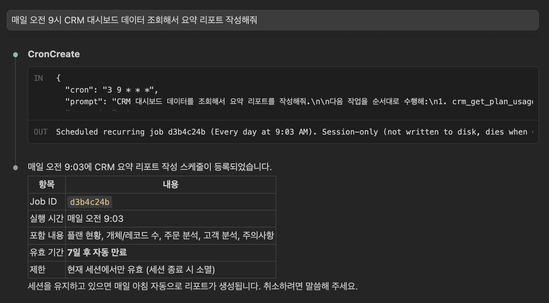 AI가 워크플로우를 설계하고, 초안(DRAFT) 상태로 만들어줍니다. CRM 대시보드에서 한 번 확인한 뒤 활성화하면 끝입니다.
