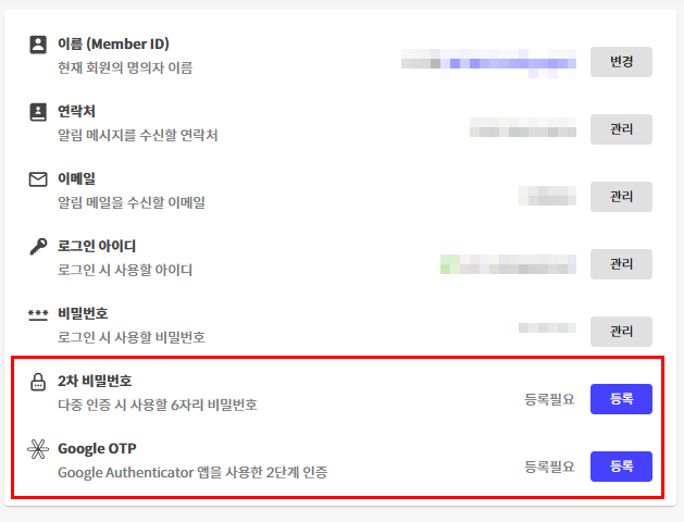 Google Authenticator 앱을 사용한 2단계 인증을 진행할 수 있습니다. 내정보에서 등록 후 사용 가능합니다.