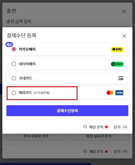 해외카드는 "해외 원화 결제"로 진행됩니다. 원화(KRW)가 아닌 다른 통화 수단은 제공하지 않습니다.