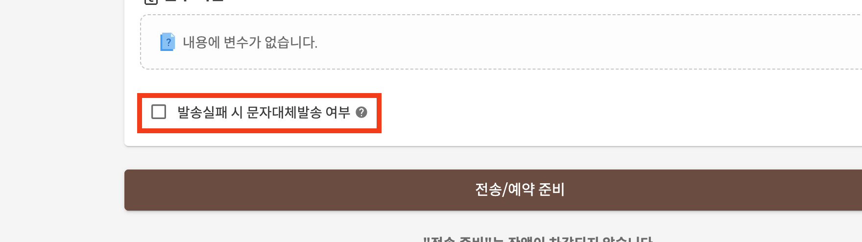 문자 메시지로 발송을 의도하지 않은 경우, 발송 설정에서 문제 메시지 대체발송 옵션을 해제한 후 발송해 주세요.